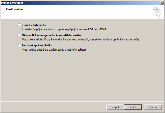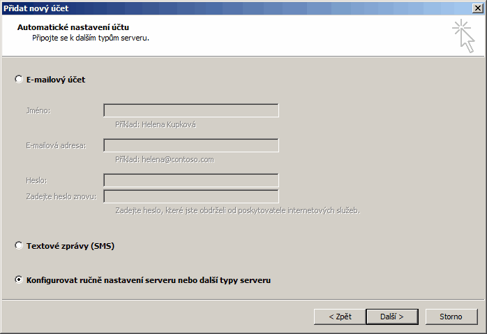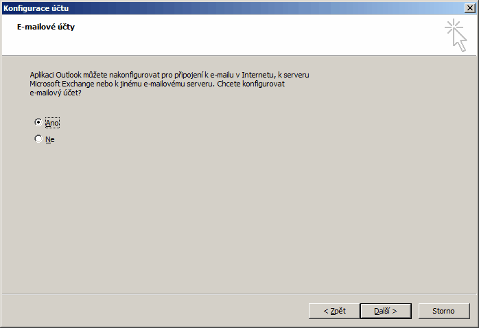 Spustíme-li Outlook poprvé, zeptá se nás, jestli chceme nakonfigurovat účet. Jinak můžeme v Outlooku spustit Soubor\Nastavení účtu, kde pak lze vytvořit účet další nebo účet změnit. Podle toho, kterou cestou půjdeme se ocitneme v určitém bodě následujícího průvodce. Jednotlivé kroky průvodce vyplňujte podle obrázků: